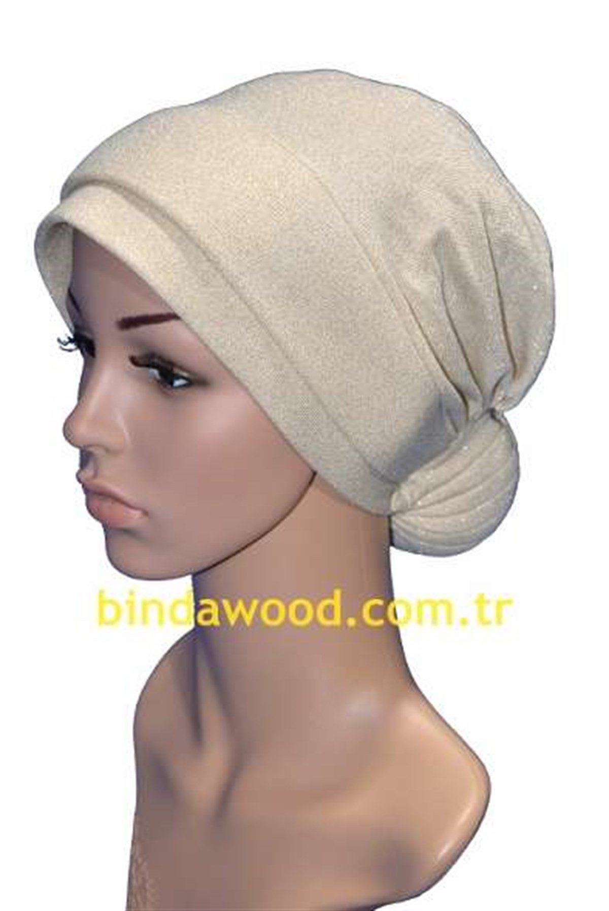Açık Bej Katlı Topuzlu Tesettür Türban modeli her mevsim uygun alanlarda başörtü olarak kullanılabilir