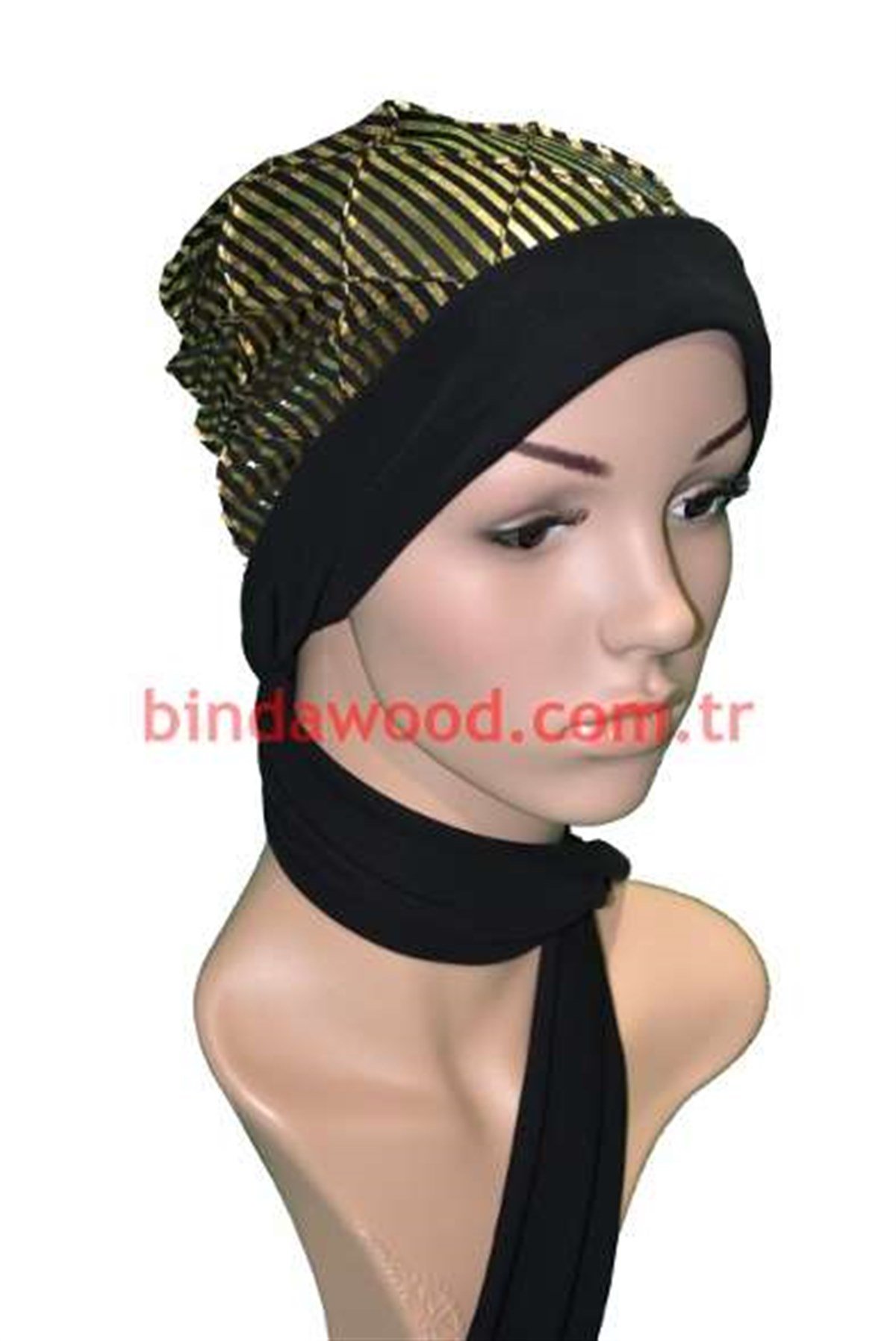 Atkılı Gold Siyah Abiye Tesettür Türban modeli her mevsim uygun alanlarda başörtü olarak kullanılabilir