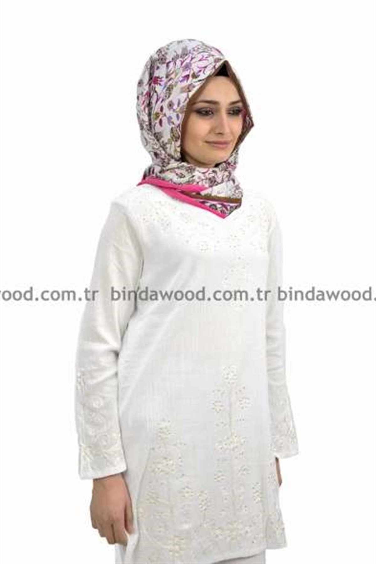 Beyaz Simli Nakışlı Pamuklu Tunik