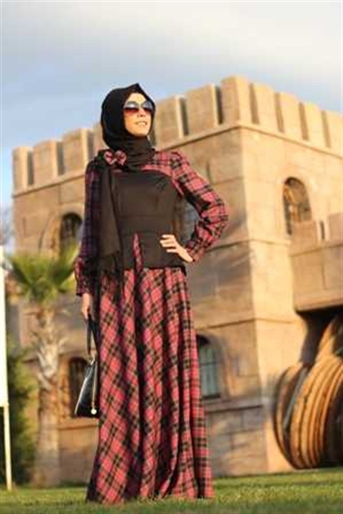 Fuşya Elbise Şal 2 li Deri Ekoseli Elbise ve Şalı