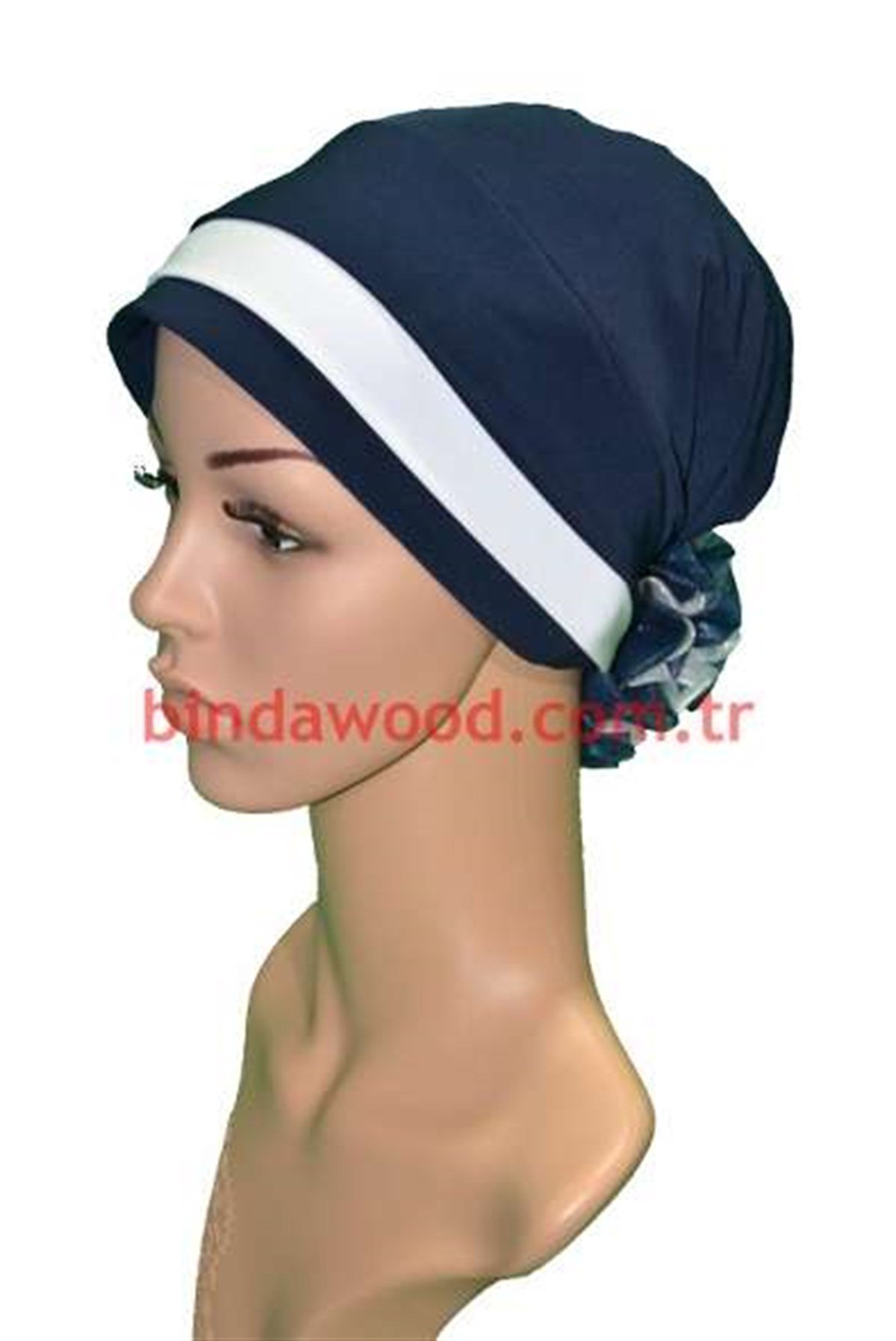 Güllü Beyaz Lacivert Abiye Tesettür Türban modeli her mevsim uygun alanlarda başörtü olarak kullanılabilir