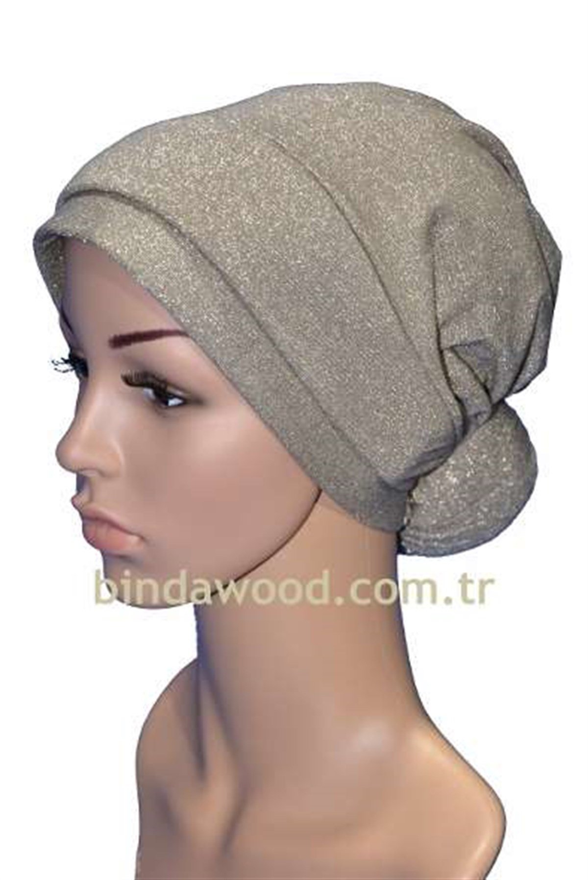 Simli Bej Katlı Topuzlu Tesettür Türban modeli her mevsim uygun alanlarda başörtü olarak kullanılabilir