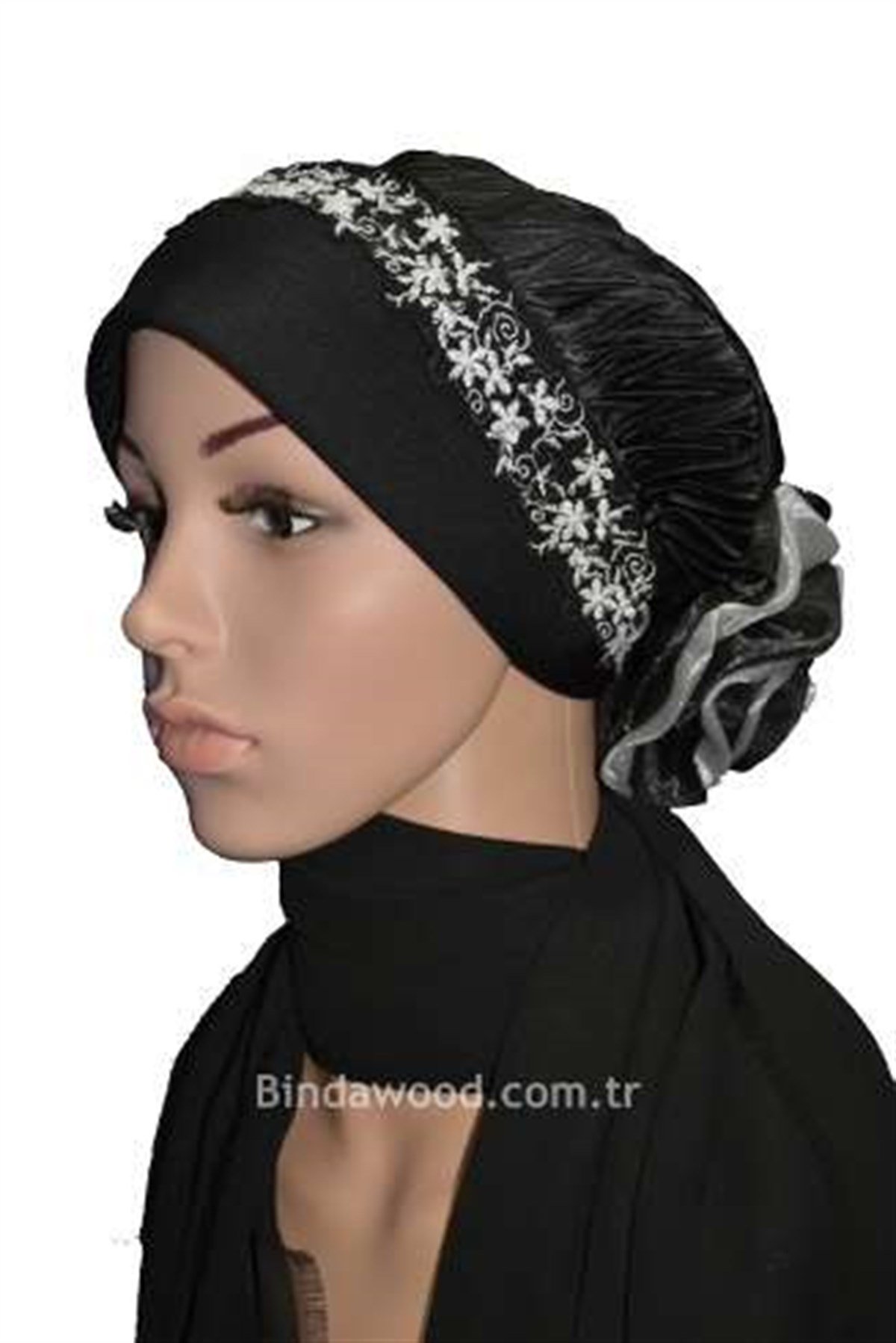 Siyah Güllü Abiye Türban modeli her mevsim uygun alanlarda başörtü olarak kullanılabilir