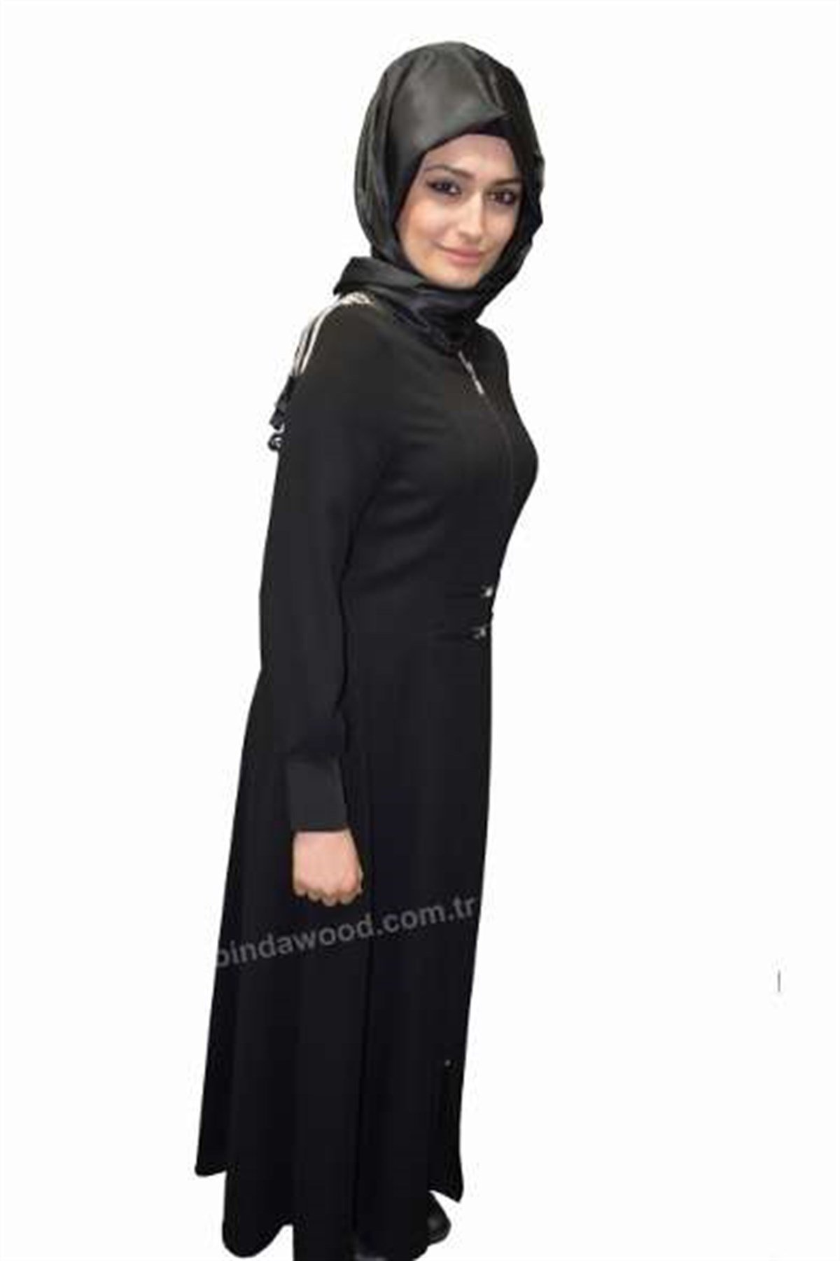 Zincir Omuzlu Siyah Fermuarlı Tesettür Ferace